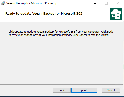 8.Click Update on the Ready to update Veeam Backup for Microsoft 365 page.