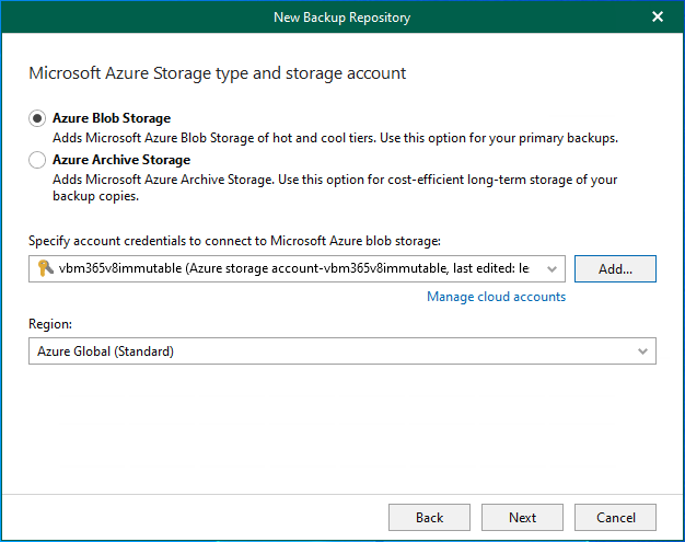59. On the Microsoft Azure Storage Account page, select Azure Global (Standard) in the Region field and click Next.