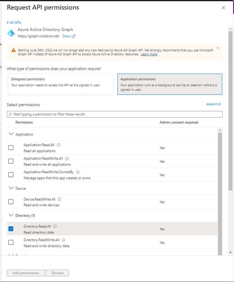 Microsoft is ending support for the Azure Active Directory Graph API. To allow for continued service, if your application providers migrate all Azure Active Directory Synchronization integrations to the MS Graph API, you need to change your API permissions.