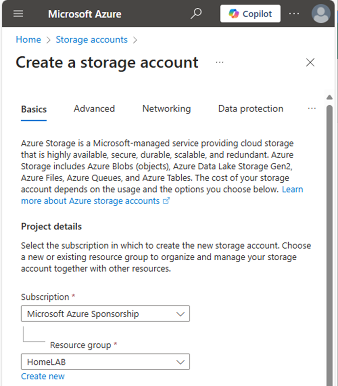 3.Select Storage on the Create a resource page, and click Create at Storage account.