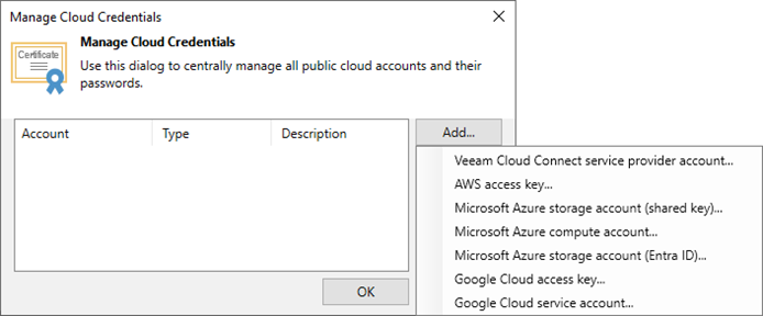 5.On the Manage Cloud Credentials page, Click Add and select Microsoft Azure storage account (shared key).