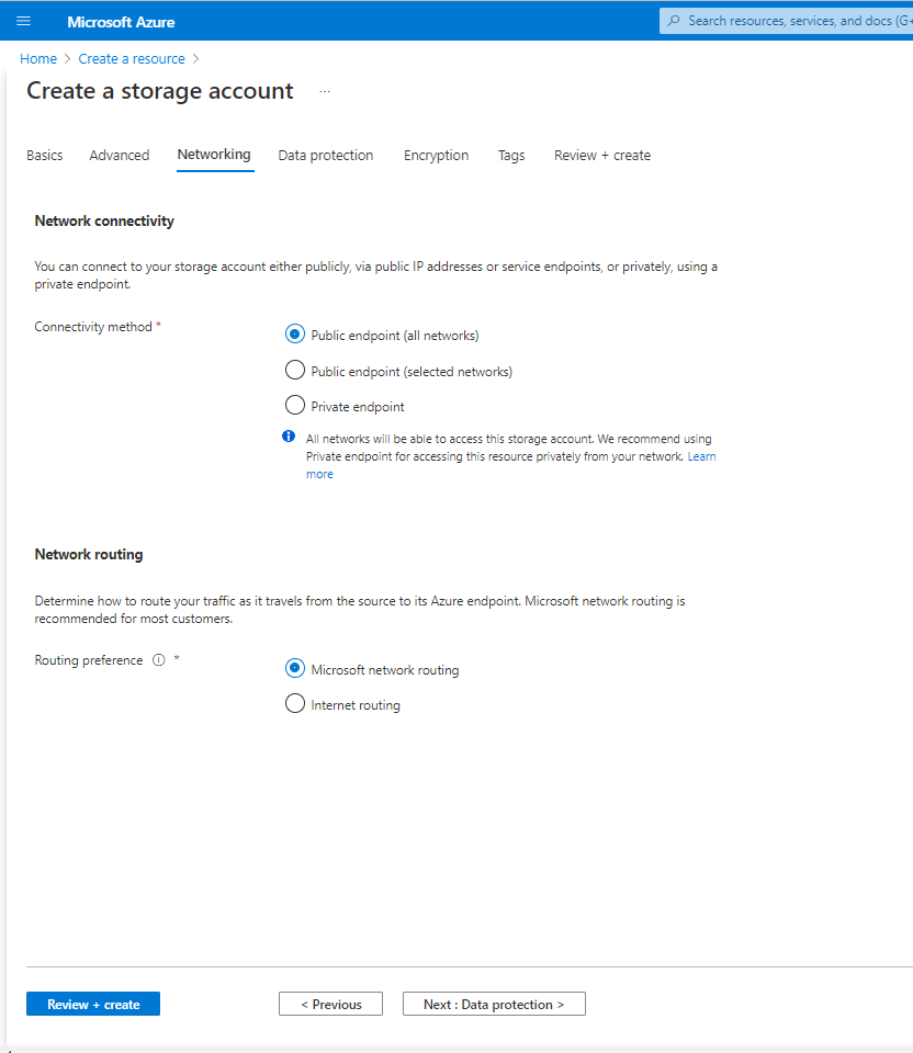 7.On the Networking page, configure as follow and then click Next: Data protection.