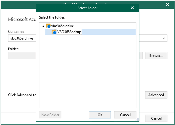 30.On the Microsoft Azure Blob container page, select an Azure Blob container (you created it previously when you create the Azure Storage Account and settings) and click Browse on Folder.