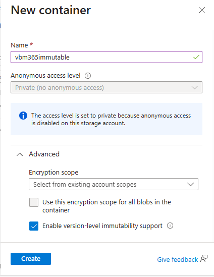 45. Expand Advanced, select Enable version-level immutability support and click Create.