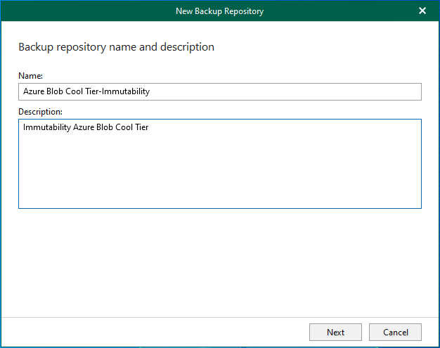 52. On the Object storage repository name and description page, type Azure Blob Cool Tier as the Object storage repository name and click Next.