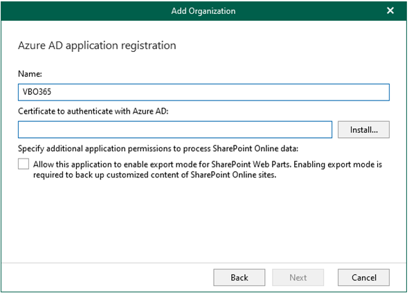 8.Click Install to specify an SSL certificate that you want to use for data exchange between Veeam Backup for Microsoft 365 and an Azure AD application.