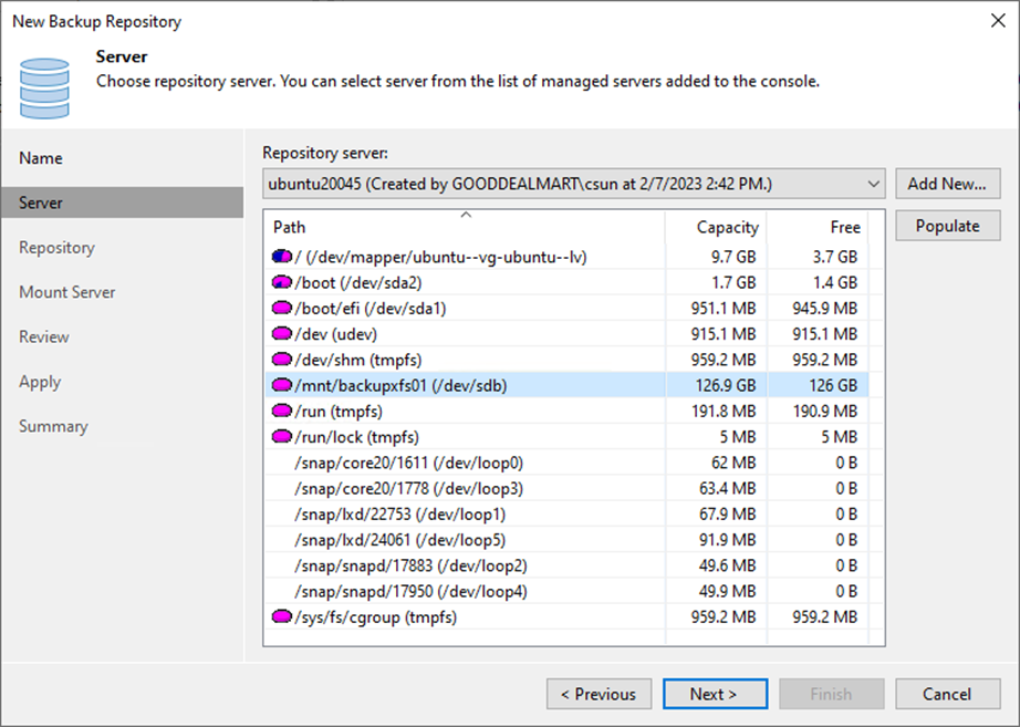 10. On the Server page, select the Linux server from the Repository server drop-down list and click Populate.