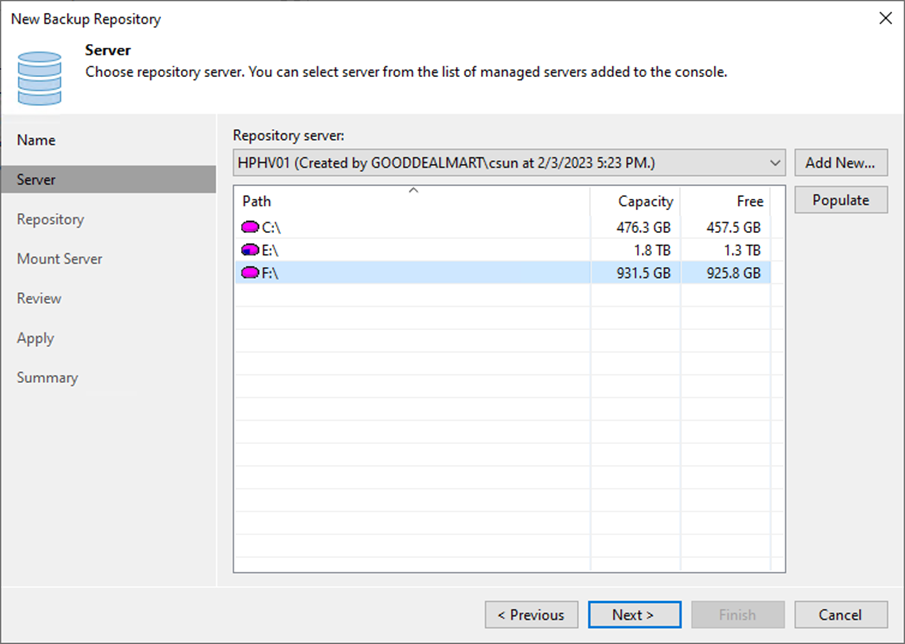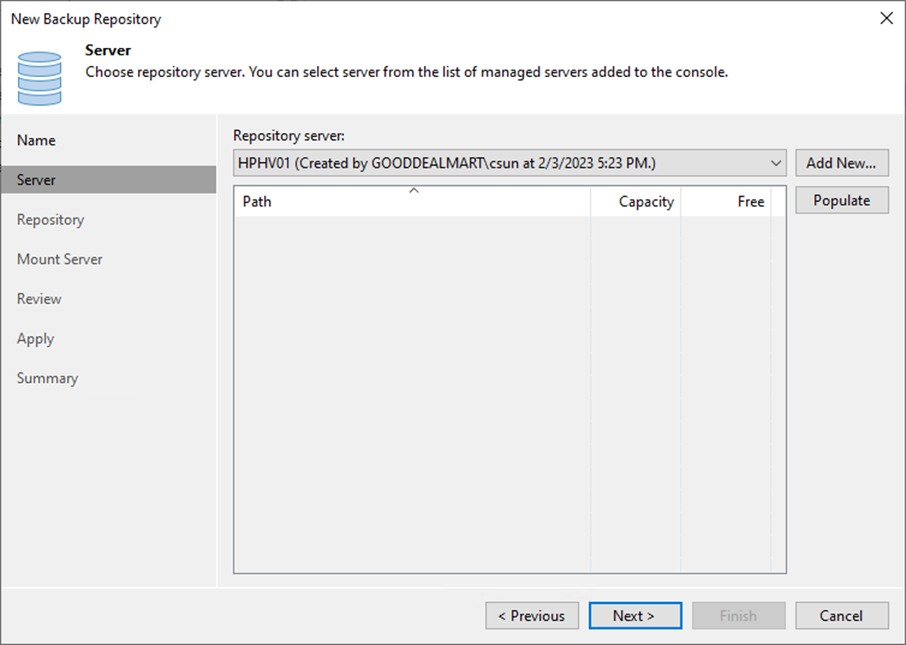 12. On the Repository page, click Populate to review the disk capacity and free space.