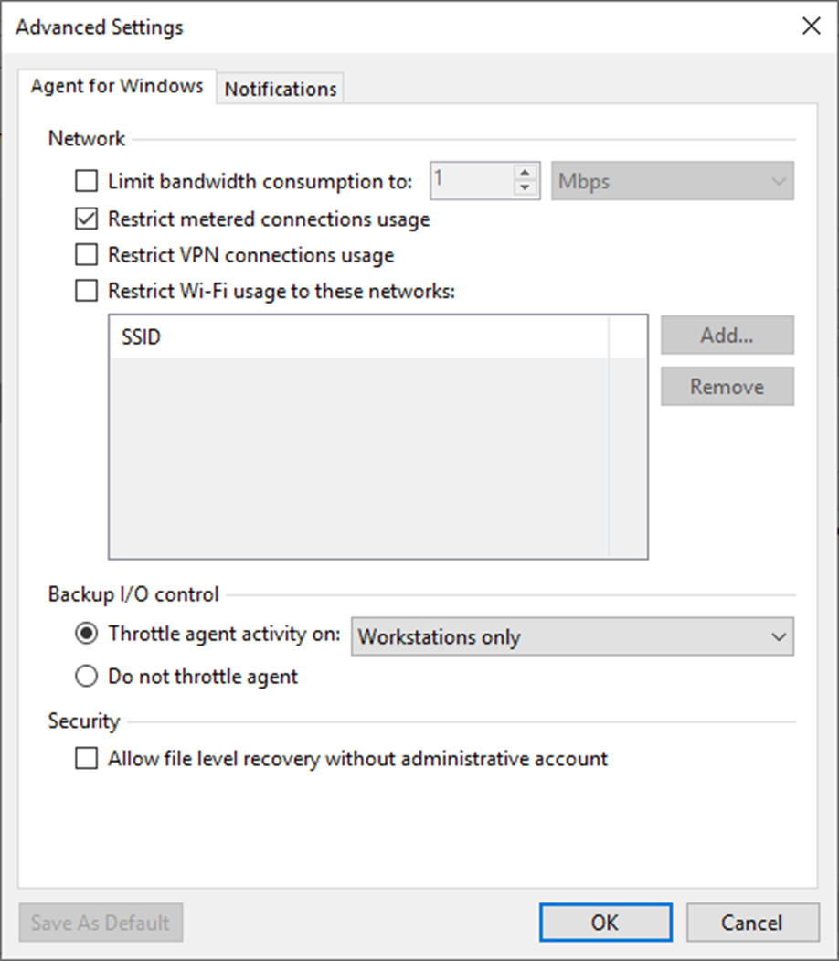 - Restrict Wi-Fi usage to these networks: restrict usage of wireless networks for Veeam Agent running on Microsoft Windows workstations.