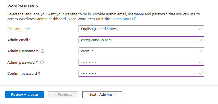 12.Under WordPress setup, choose your preferred Site Language, then type an Admin Email, Admin Username, and Admin Password. The Admin Email is used for WordPress administrative sign-in only. Click Next: Add-ins>.