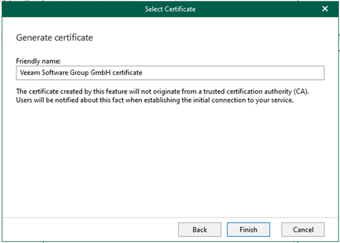7. On the Generate Certificate page, enter the specific name for the certificate in the Friendly name field and click Finish.