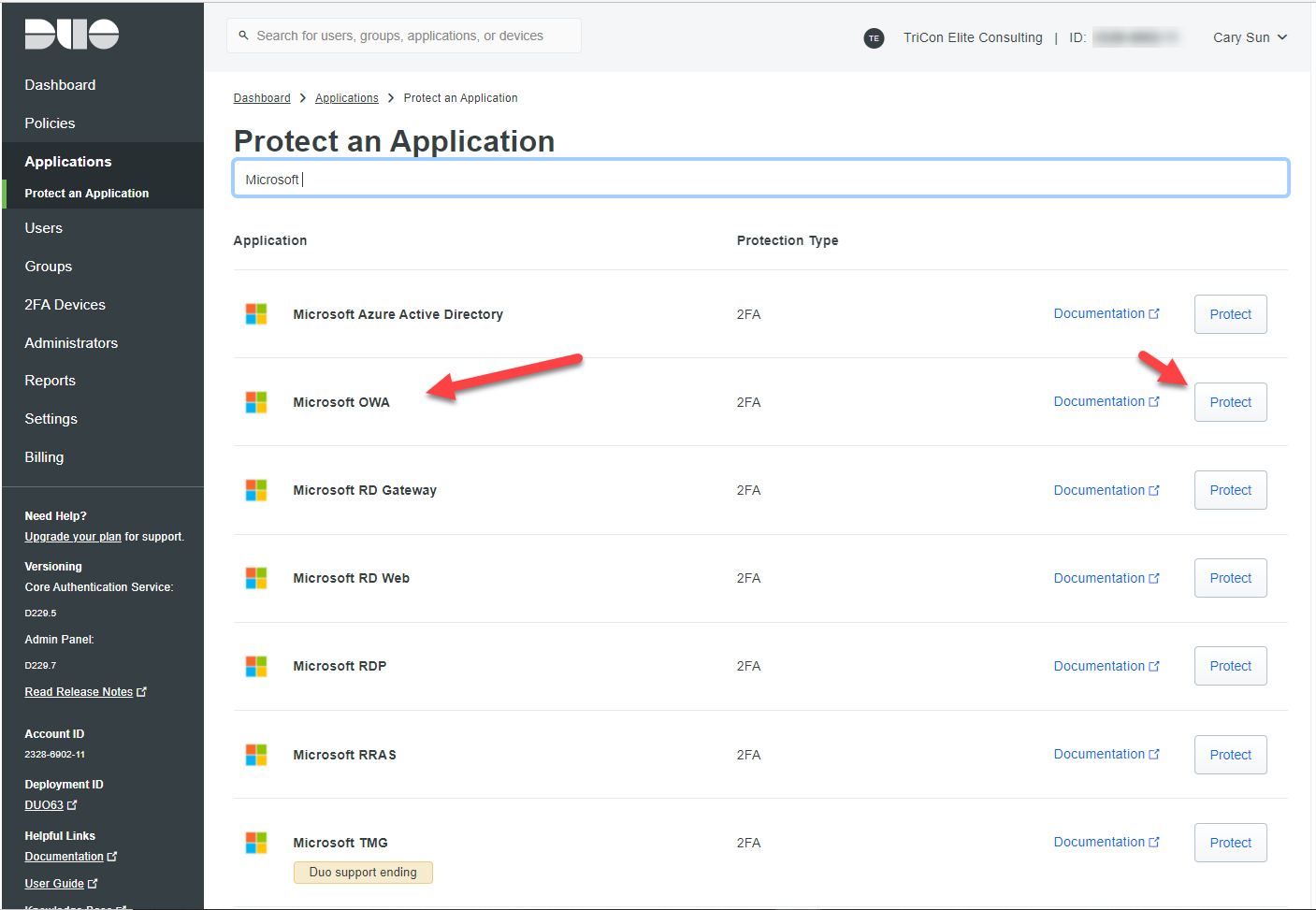 8.On the Protect an Application, locate the entry for Microsoft OWA in the applications list, click Protect.