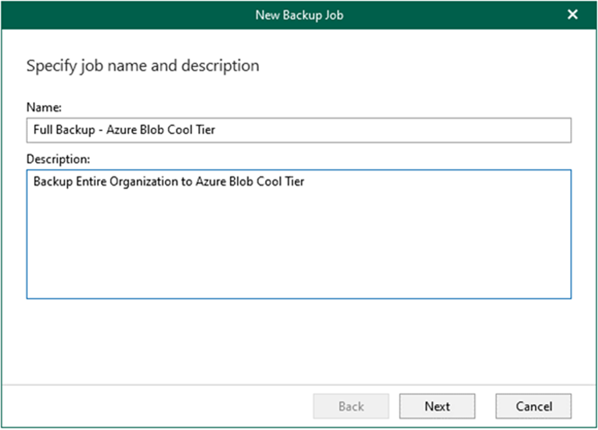 The procedure creates a backup job to backup the organization objects to Azure Blob Cool Tier repositories.