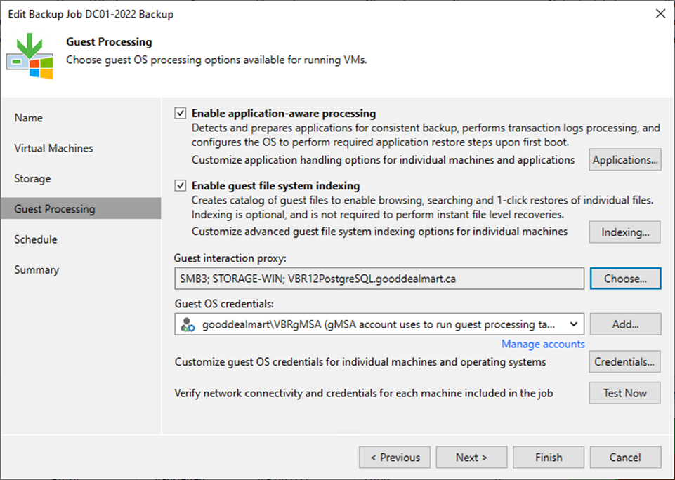 83. On the Guest Processing page, click Test Now to verify network connectivity and credentials for each machine included in the job.