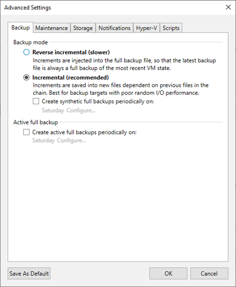 35. Select Incremental and disable synthetic full and active full backups to create a forever forward incremental backup chain.