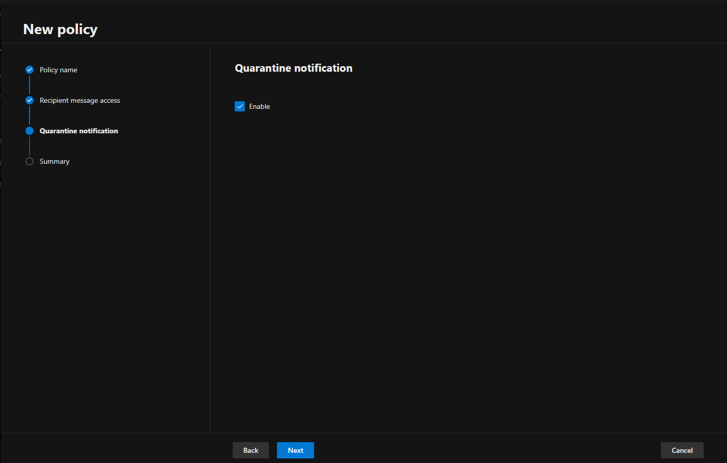 13.Select Enable on the Quarantine notification page and click Next.