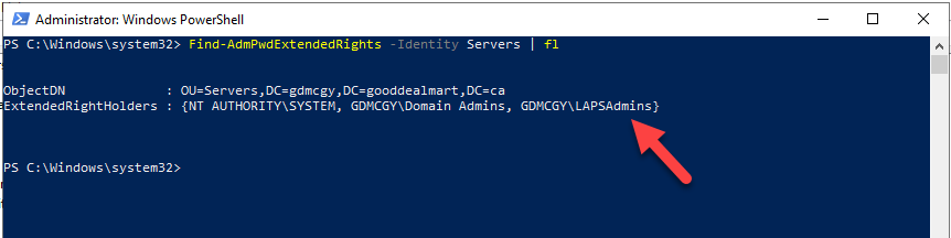 20.Run below cmdlet to verify extended permissions to LAPSAdmins security group.