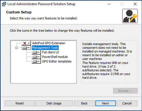 7.On the Custom Setup page, deselect AdmPwd GPO Extension and select Management Tools. If you also managing the local administrator account of the management server, you also need to install AdmPwd GPO Extension. In my case, I am installing it in a Domain controller so I do not need it.