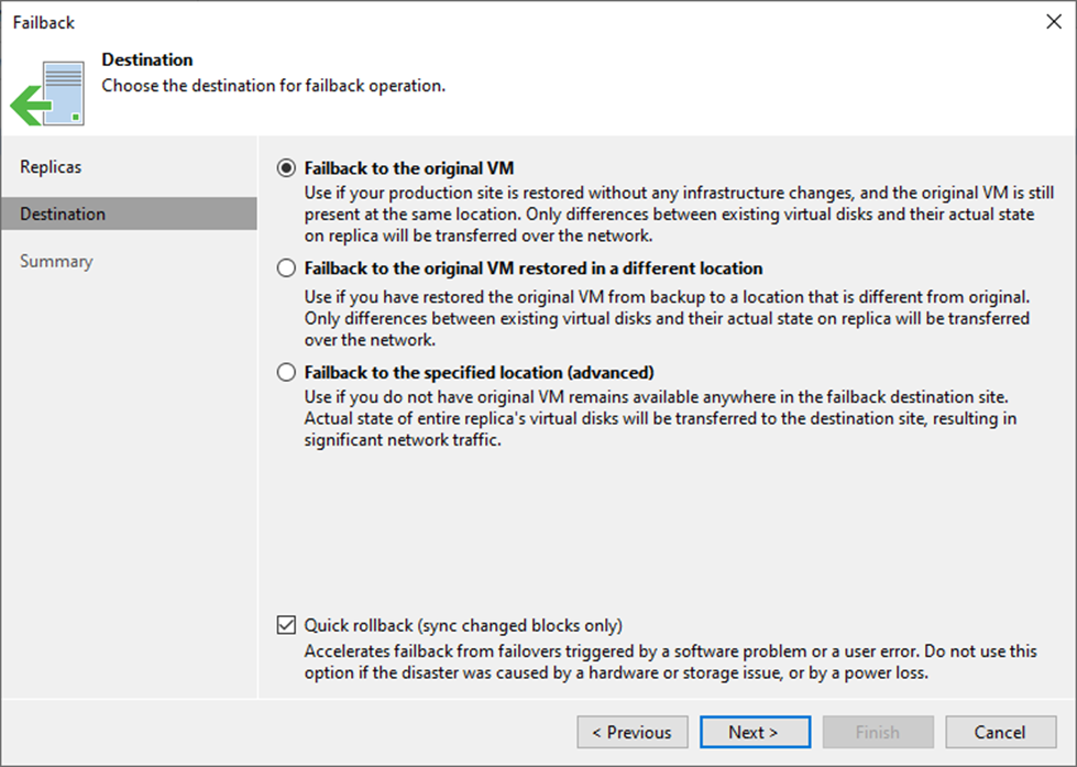 9. Select Quick rollback (sync changed blocks only) If you want to fasten failback, and the original VMs had problems at the guest OS level.