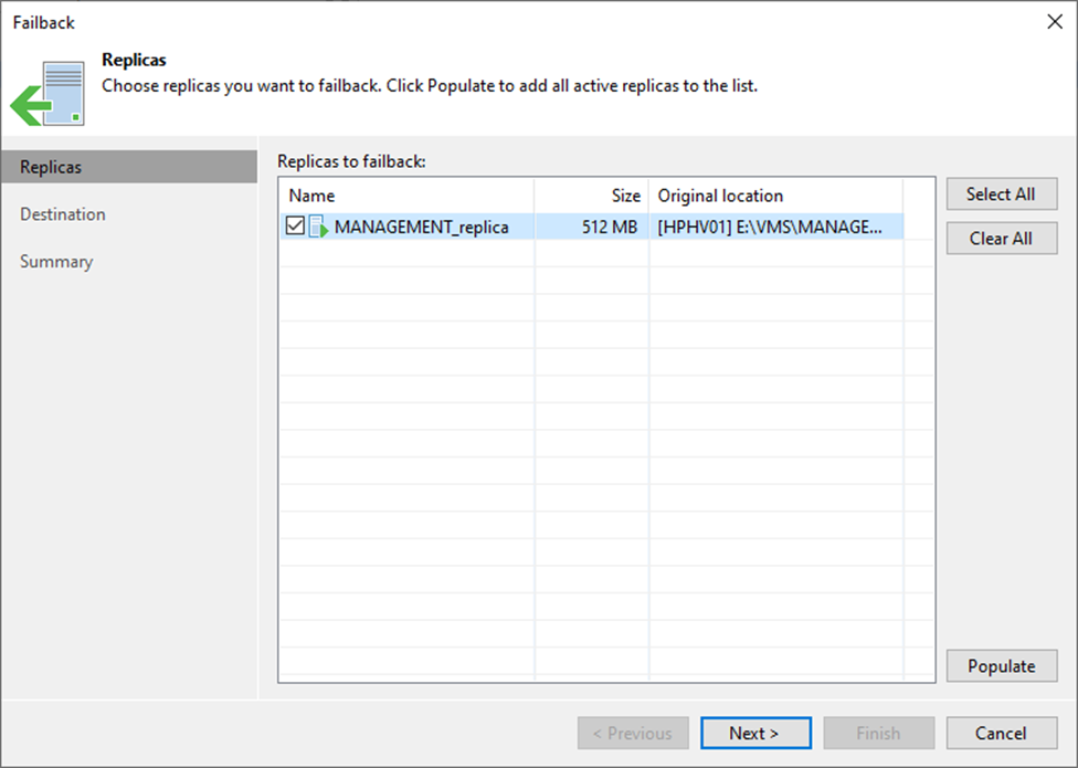 6. Click Populate on the Virtual Machine page to update the replicas ready for the failback list.