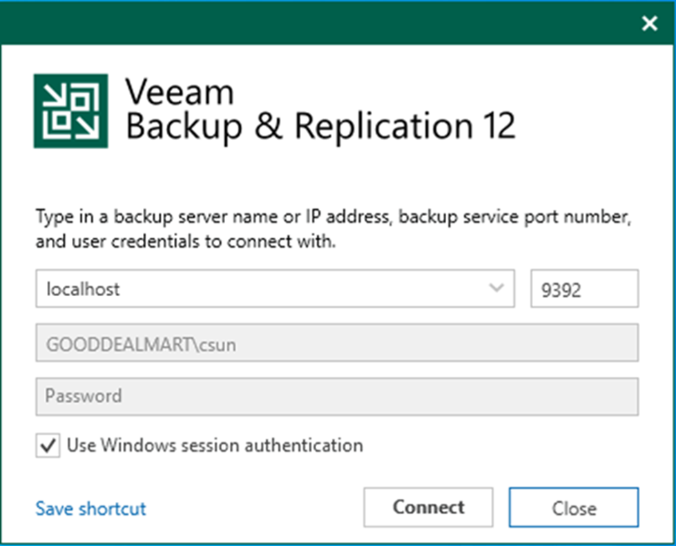 2. Open the Veeam Backup & Replication 12 Console and click Connect.