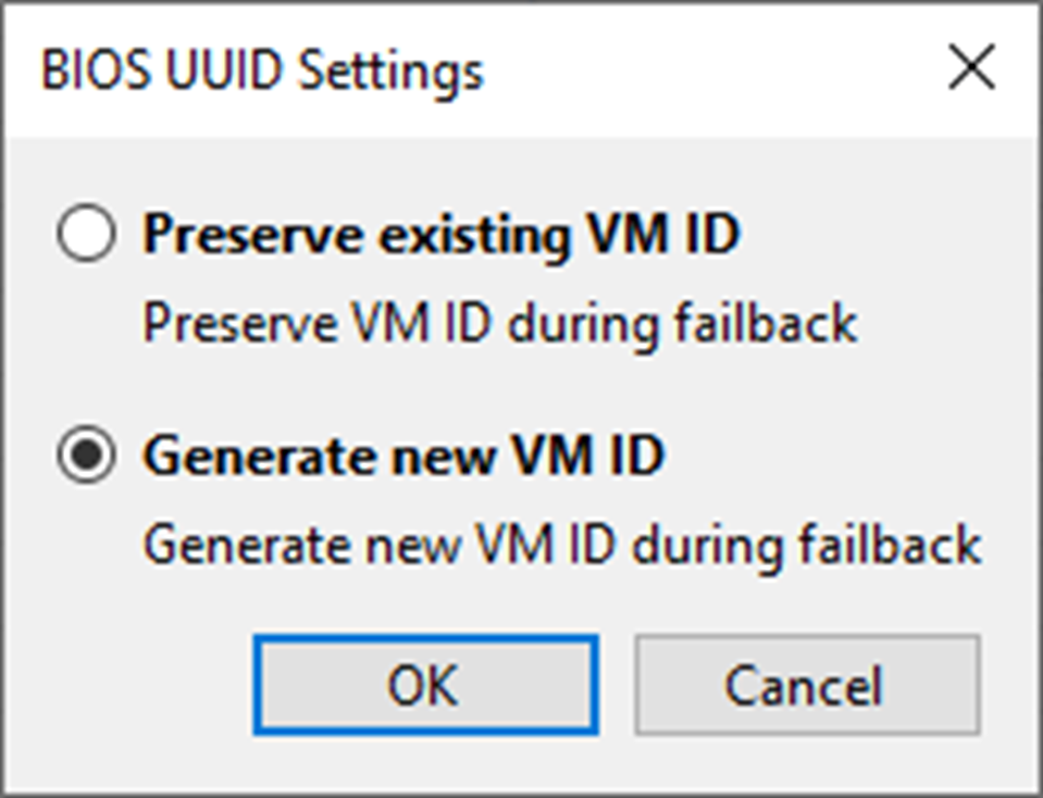 27. On the BIOS UUID Settings page, select Generate new VM ID and click OK.