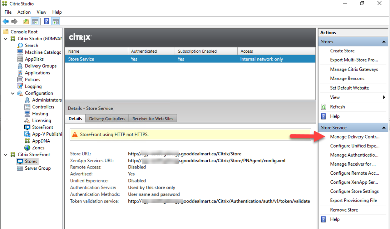 22.Open Citrix Studio, under the Citrix StoreFront, select Stores, click Manage Delivery Controller Store Service.