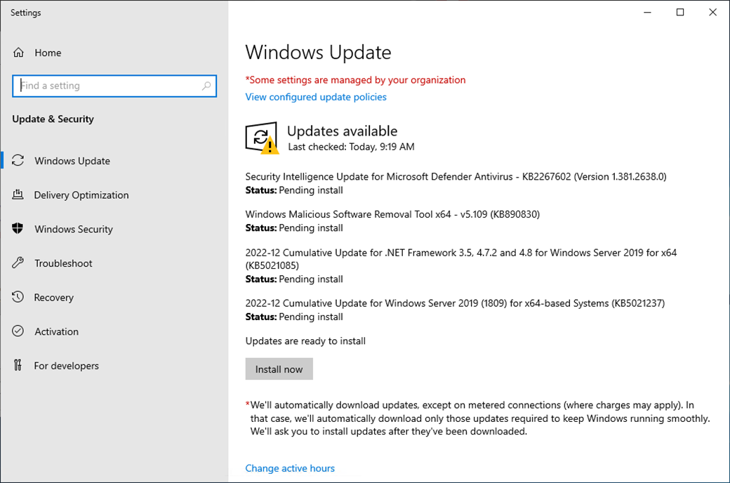 25. Open Windows Update on the first Cluster node, install windows patches and reboot the server if required.