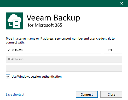 15. Enter the Veeam Backup for Microsoft management server name and click Connect.