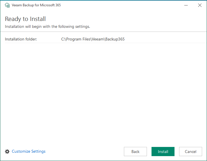7. Click Install on the Veeam Backup for Microsoft 365 page.