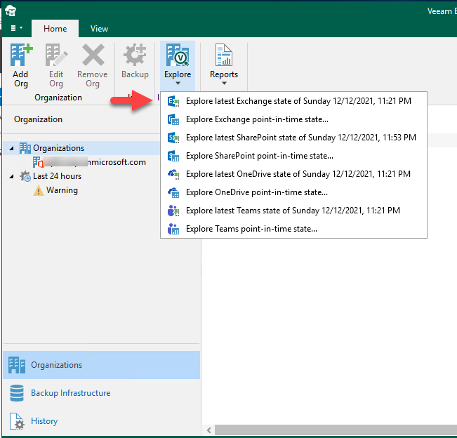 29.On the Veeam Backup for Microsoft Office 365 console, click Explore and select Veeam Explorer for Microsoft Exchange.