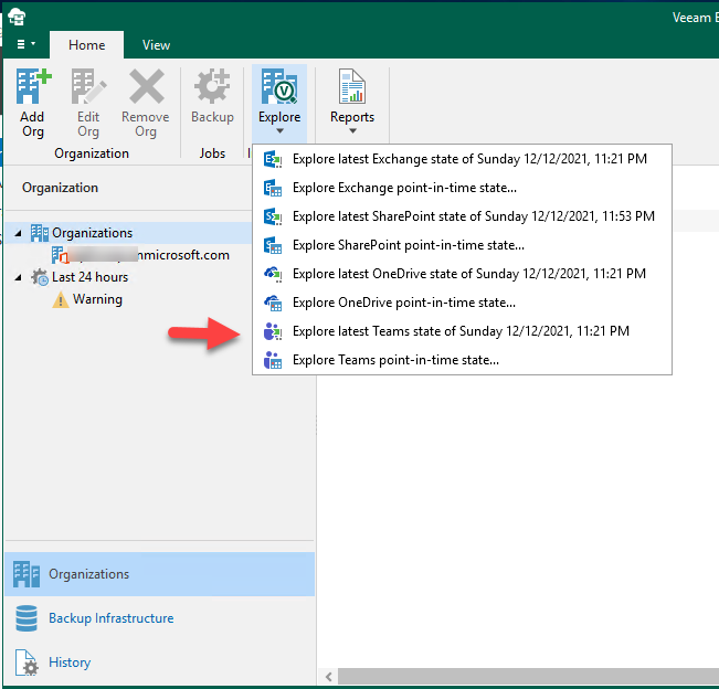 33. On the Veeam Backup for Microsoft Office 365 console, click Explore and select Veeam Explorer for Microsoft Teams.