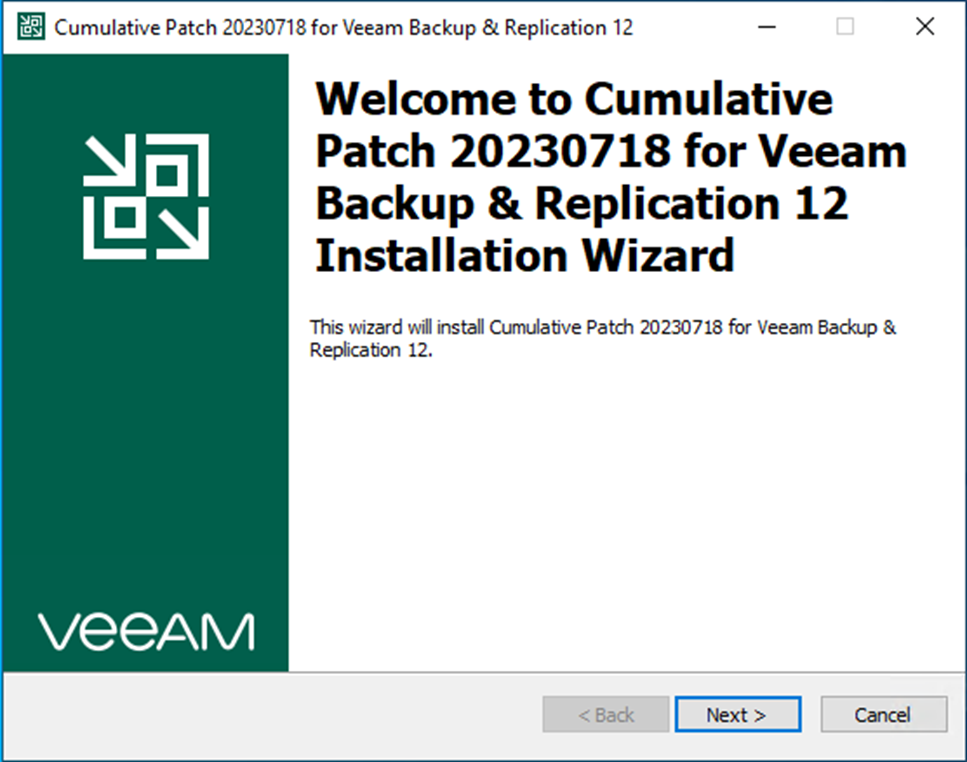 10. On the Welcome to cumulative patch P20230718 for Veeam Backup & Replication 12 Installation Wizard page and click Next.