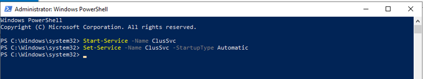 Start-Service -Name ClusSvc Set-Service -Name ClusSvc -StartupType Automatic