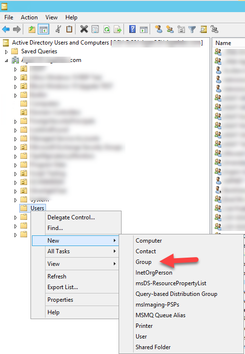 9.On the Active Directory Users and Computers page, right -click Users OU, select New, click Group.