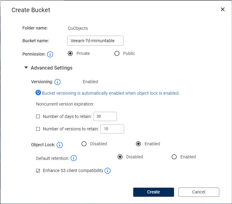 17.In the Object Lock, select Disabled as Default retention, select Enhance S3 client compatibility and click Create.