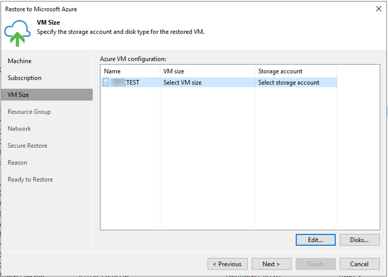- From the Size list, select a size for the restored VM. Make sure that you select the right VM size that corresponds to the initial machine configuration.