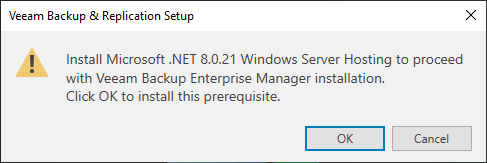 7.Click OK to install Microsoft .NET 8.0.21 Windows Server Hosting prerequisite.