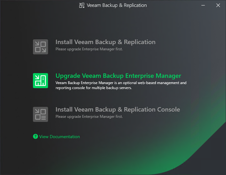 8.Select Upgrade Veeam Backup Enterprise Manager.