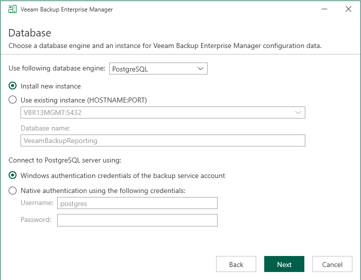 20.If a PostgreSQL Server is already installed locally or remotely, select the Use existing instance of PostgreSQL Server and enter the instance name in the HOSTNAME: Port number format. In the Database field, specify a name for the Veeam Backup Enterprise Manager Reporting database.