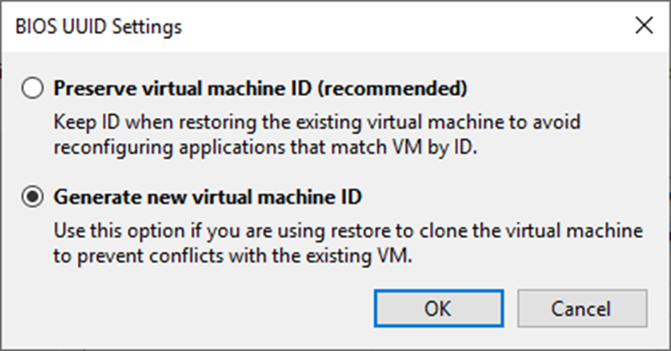 26. On the BIOS UUID Settings, select Generate new virtual machine ID.